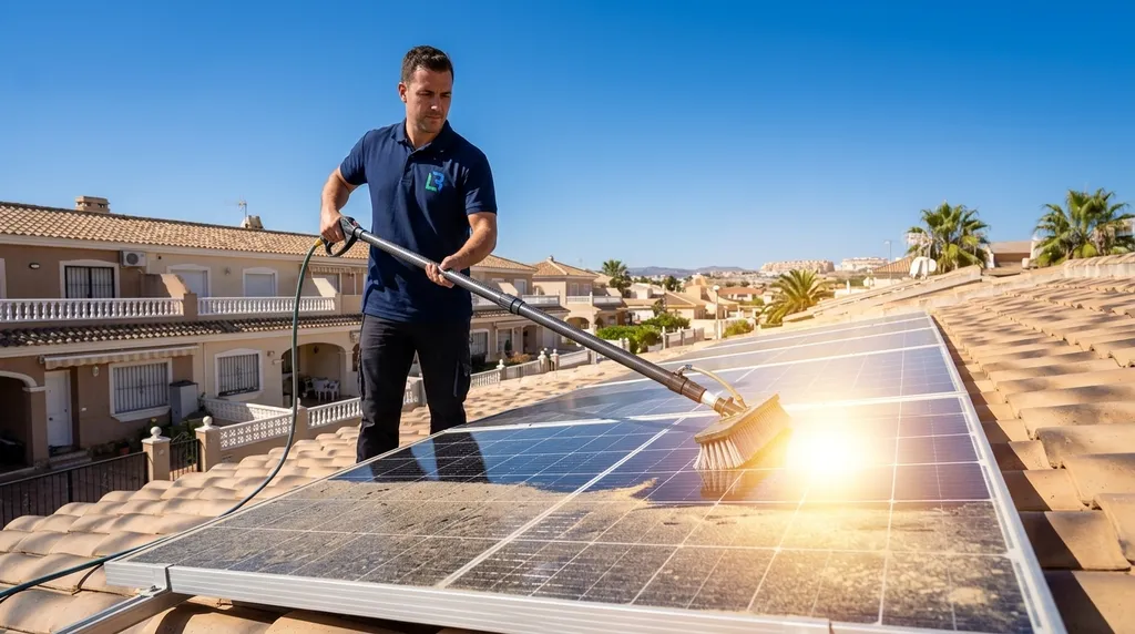 Como parte de nuestros servicios de limpiezas especiales, aplicamos técnicas seguras y certificadas. No utilizamos detergentes abrasivos ni limpiacristales comunes que puedan deteriorar el panel. Trabajamos exclusivamente con pértigas telescópicas de fibra de carbono, cepillos de cerdas extra suaves y agua pura osmotizada (libre de cal y minerales) para garantizar un acabado impecable sin dejar marcas ni residuos.